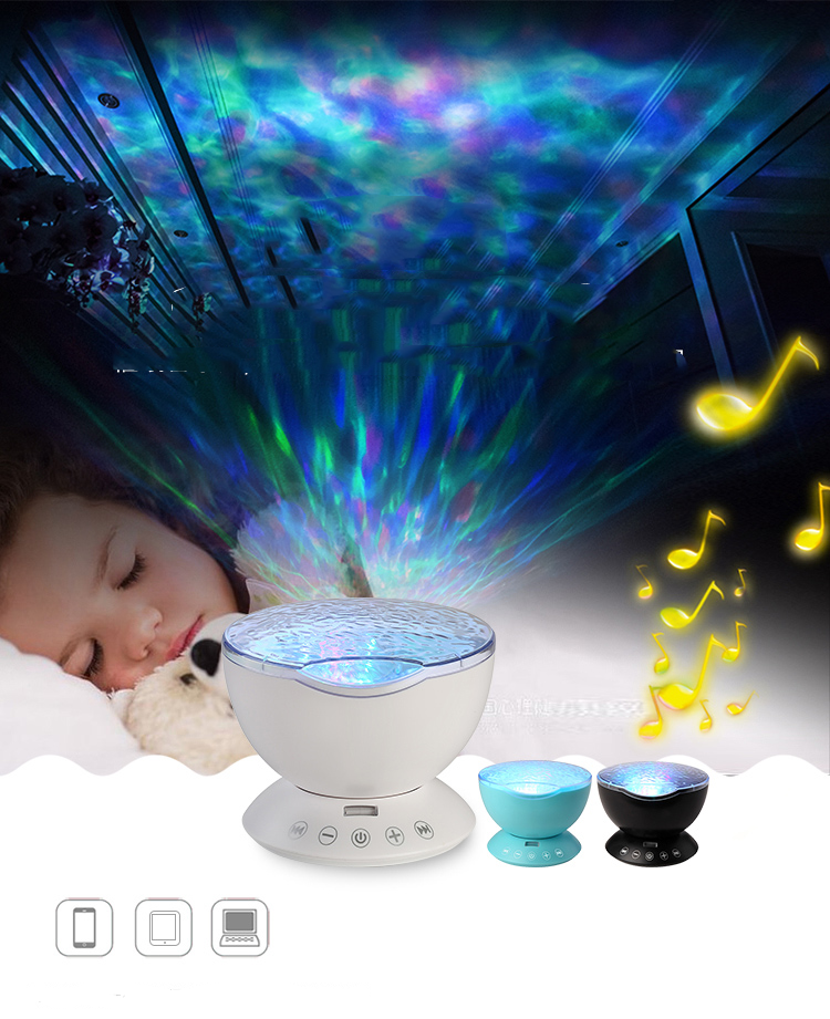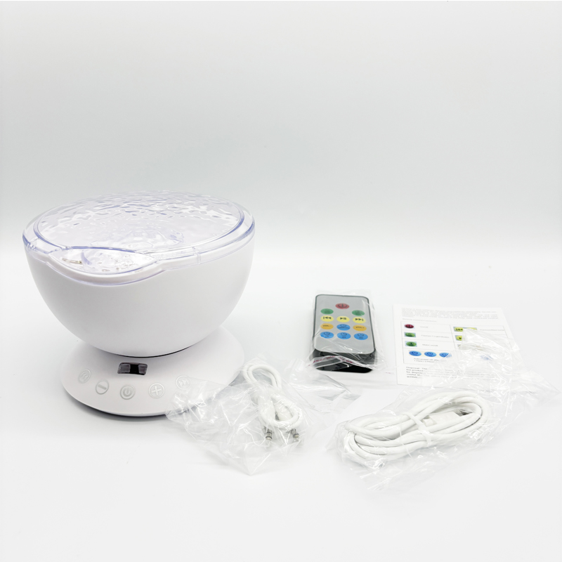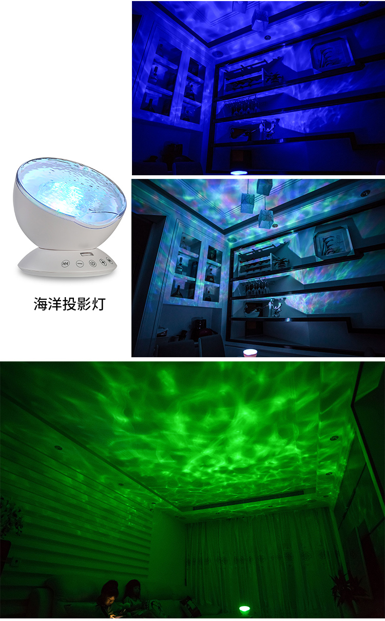 This is a classic ocean wave light equipped with a dry-battery remote controller. It features adjustable brightness, built-in hypnotic music, and 7 lighting modes. It can project colorful lights onto smooth ceilings or flat walls, creating a romantic, relaxed and cozy atmosphere for the space. Meanwhile, it supports external audio playback, allowing users to enjoy beautiful music while appreciating the pleasant ambiance, and helping them relax both physically and mentally.