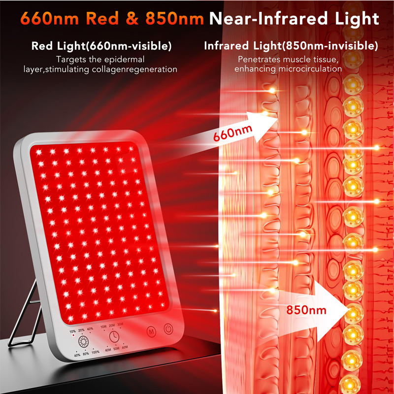 Both 660nm red light and 850nm near-infrared light are absorbed by cellular targets such as mitochondria, triggering photobiomodulation to promote cellular energy synthesis, anti-inflammatory responses, and tissue repair. Red light primarily acts on the superficial to middle layers of the skin for wound healing and skin rejuvenation, while near-infrared light penetrates deeper and is more effective in targeting deeper tissues for pain relief and hair follicle regeneration.